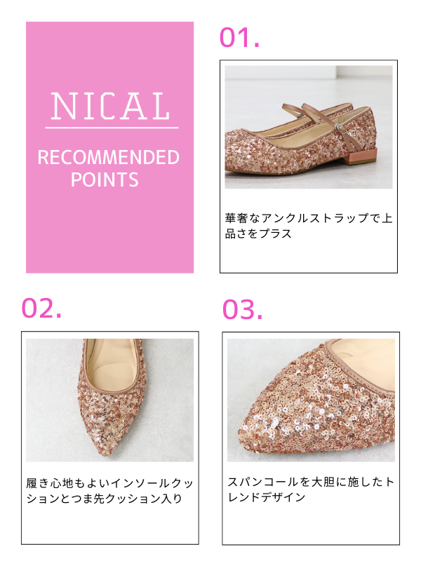 歩くたびに煌めくスパンコールを大胆に施したパンプスでトレンド感のある足元に。