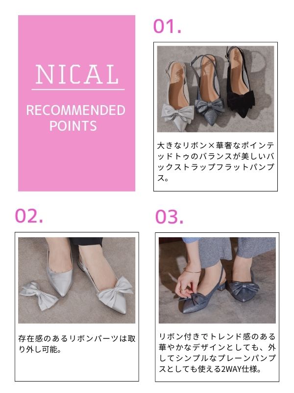 大きなリボンパーツと、華奢なポインテッドトゥのバランスが目を惹くフラットバックストラップパンプス。