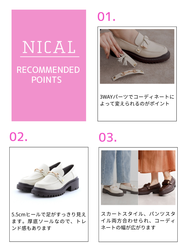 大人気、3種類の取り外し出来るパーツが付いた万能ローファー。