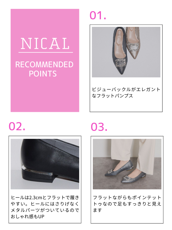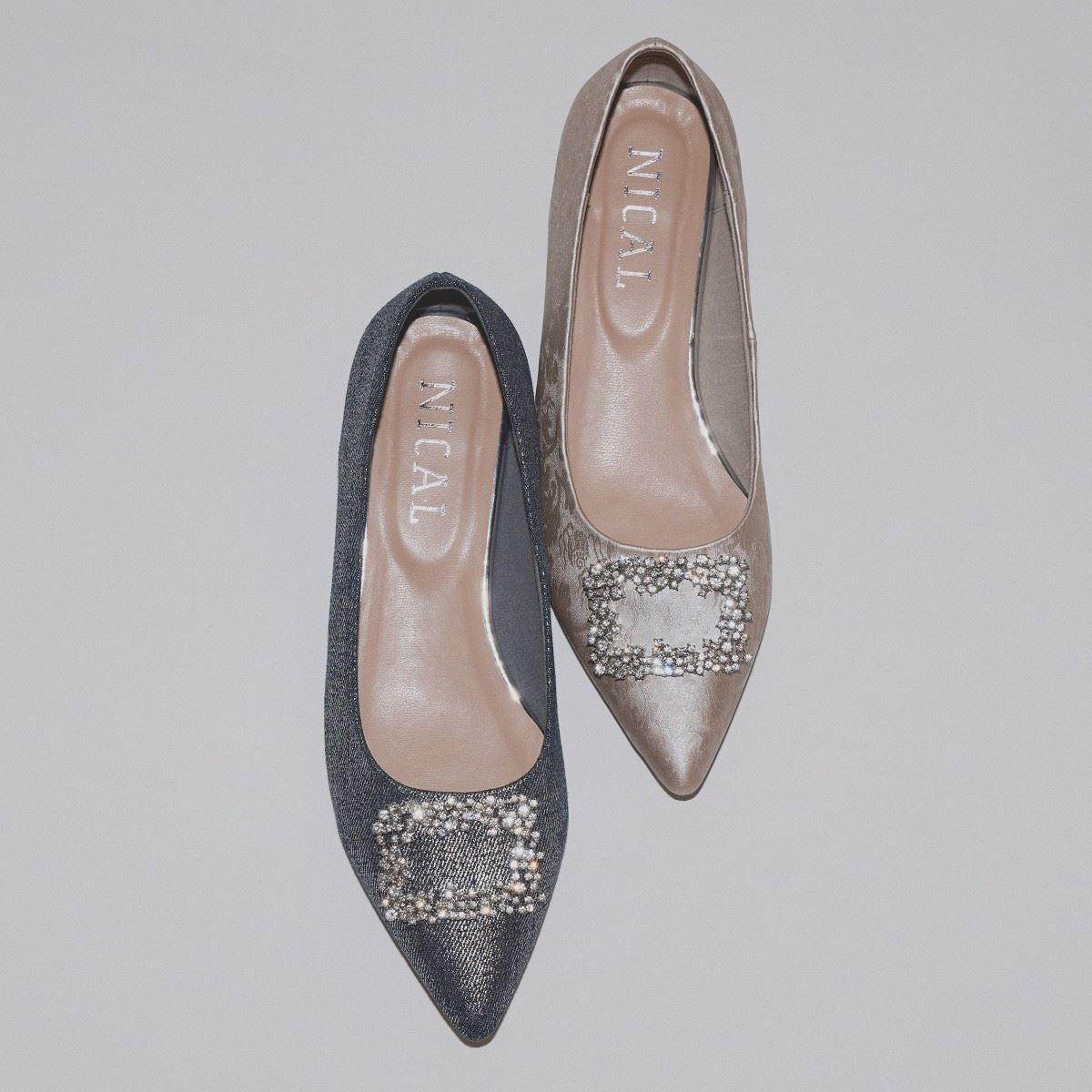 きらきらとしたビジューバックルがエレガントなフラットパンプスは、NICALで大人気のアイテム!