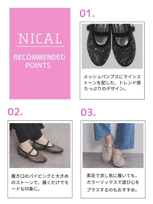 トレンド感たっぷりのメッシュパンプスが、NICALではラインストーンを付けて登場!