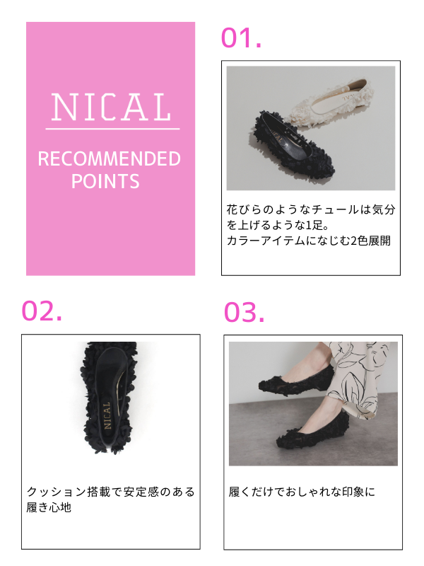 まるで花びらが付いているようなチュール素材を使用したパンプスは、今季の春夏気分を上げてくれること間違いなしの一足です。
