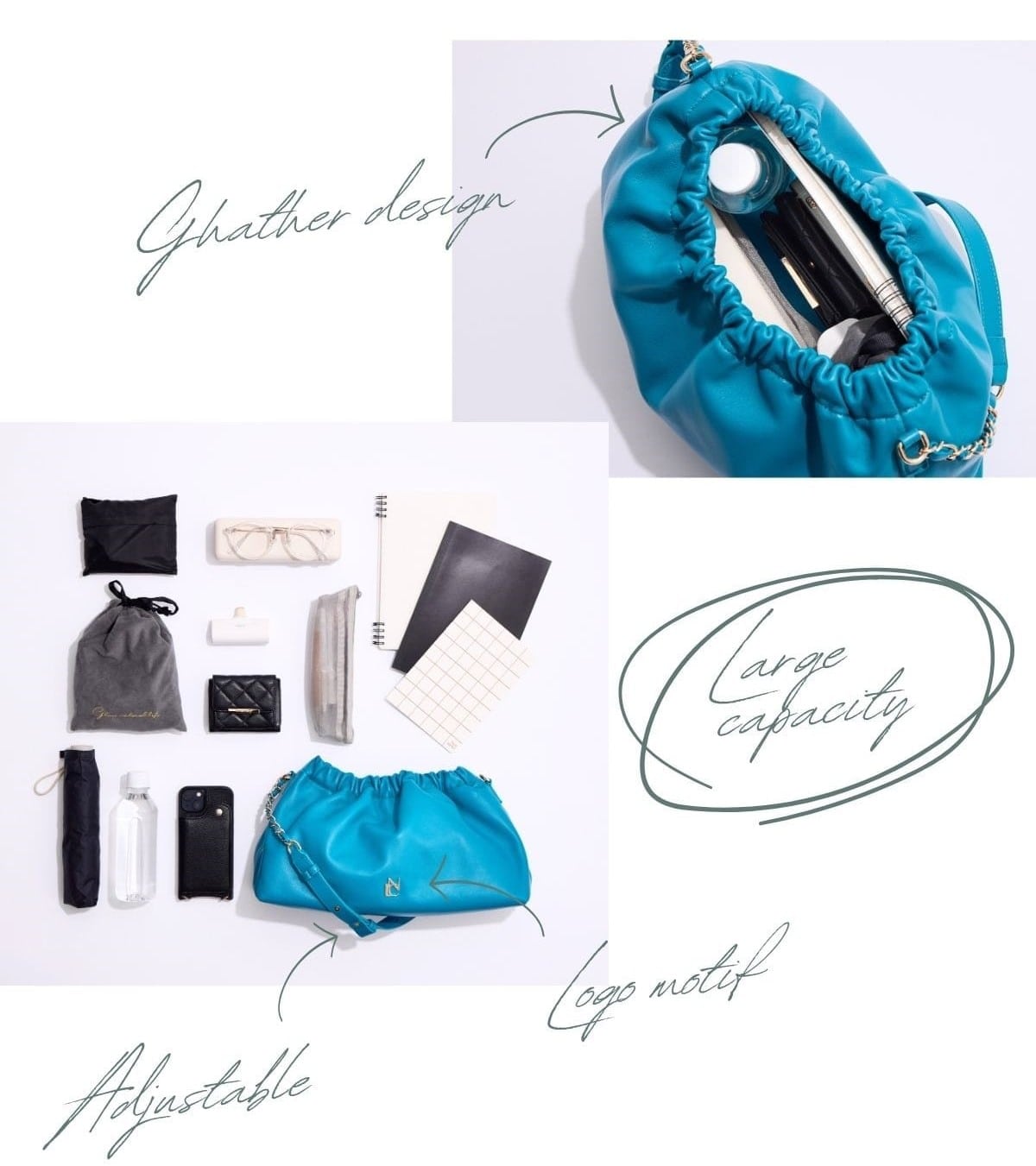NICALでは開口部にギャザーを付けて贅沢に仕上げました。 マグネットタイプで開け閉めが簡単に出来るのも嬉しいポイント。 合わせやすいブラックとブラウン、色鮮やかなブルーの3色展開で、スタイリングのアクセントになること間違いなし。 ショルダーストラップは取外しが可能で、クラッチバックとして、オケージョンやパーティースタイルにも使える優れものです。