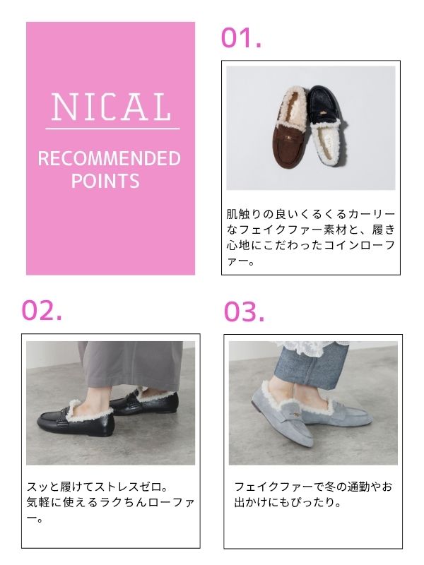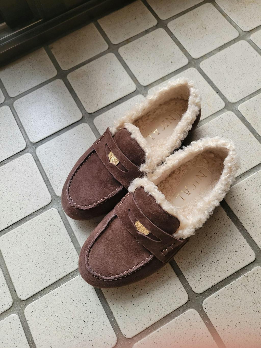 肌触りの良いくるくるカーリーなフェイクファー素材と履き心地にこだわったコインローファー。サッと脱ぎ履きできてストレスフリーならくちんアイテムです。トラッドなコインローファーでおしゃれを楽しみながら、寒い季節もあたたかく過ごせるので、冬の通勤やお出かけにもぴったり。ブラックはナチュラルな艶感を楽しめるスムースレザー、ブラウン、ブルーは秋冬らしい起毛レザーでソフトな印象に。カジュアルなデニムコーデからフェミニンなワンピースコーデにも、幅広く合わせられる万能デザインです。