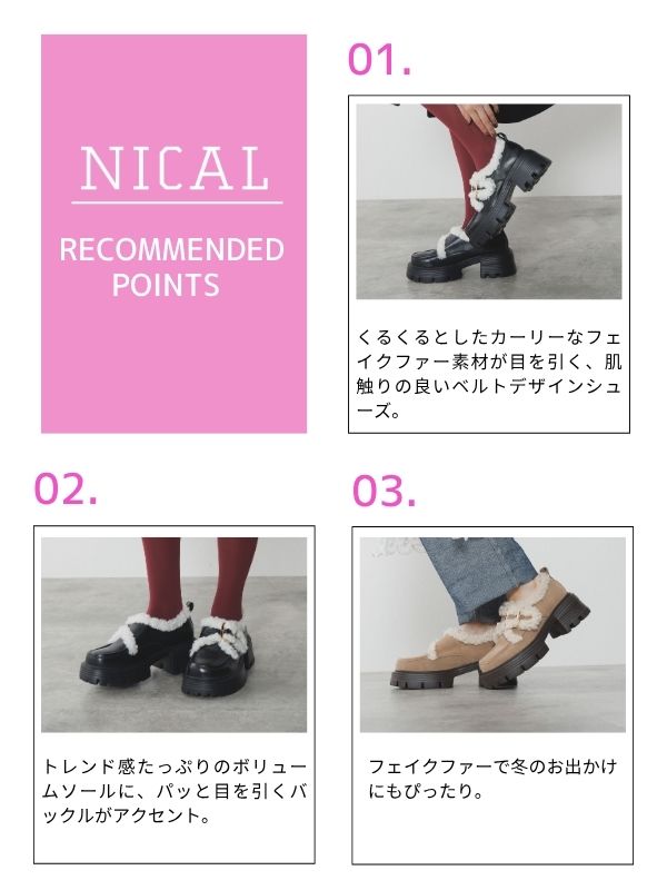 肌触りの良いくるくるカーリーなフェイクファー素材が目を引くベルトデザインシューズ。面ファスナーで着脱できるので脱ぎ履きもスムーズです。ボリュームソールと印象的なバックルデザインがカジュアルにおしゃれを楽しみながら、寒い季節もあたたかく過ごせます。冬のお出かけにもぴったりで、防寒対策としてもおすすめです。