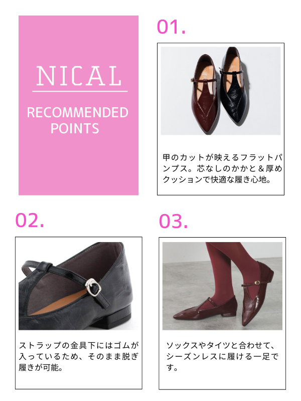 甲部分のカットが目を引くフラットパンプスは、かかとに芯が入っていないため柔らかく、厚みのある中敷クッションが足を包み込むようなストレスのない履き心地。