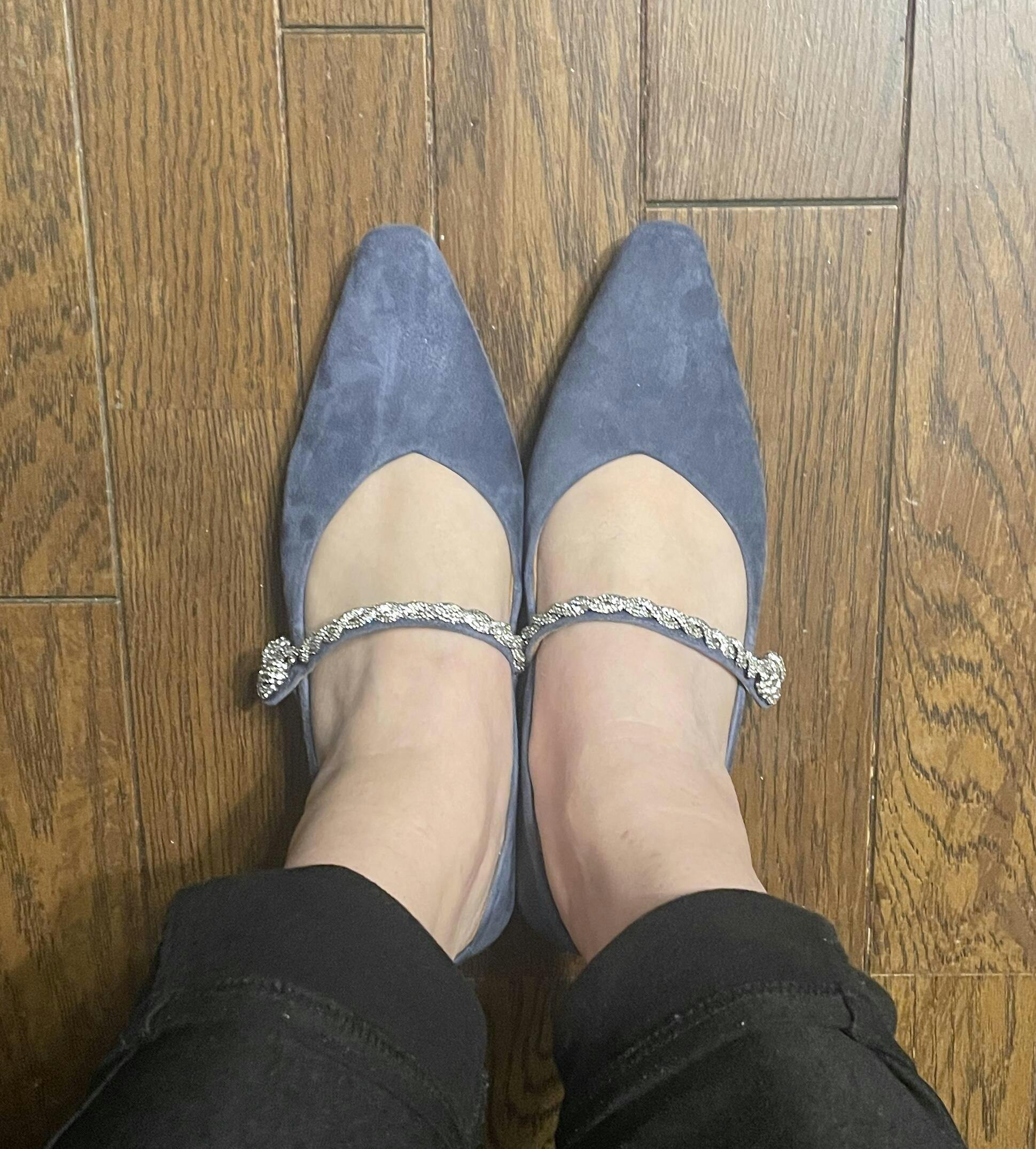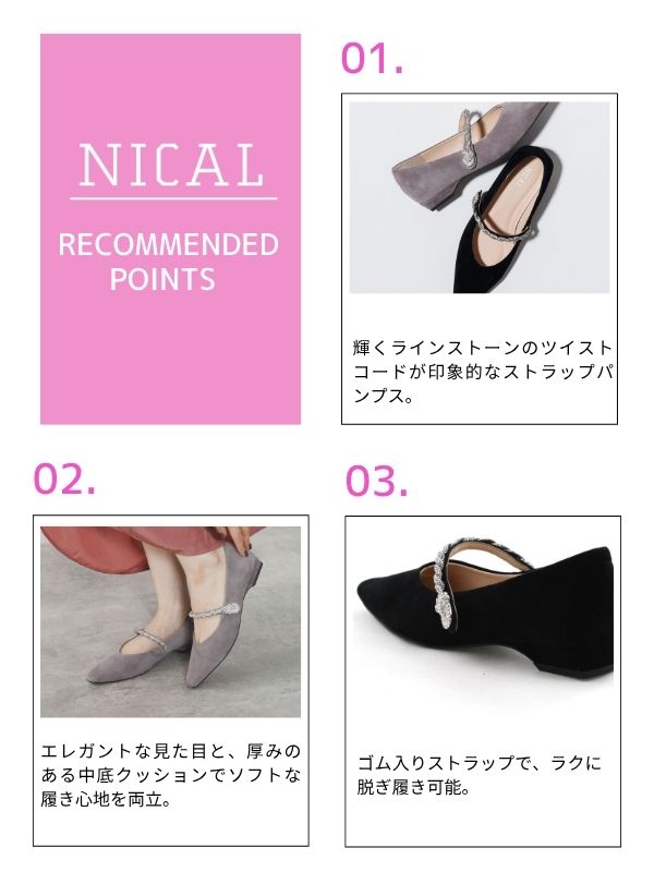ラインストーンのツイストコードが立体的な輝きを演出するストラップパンプス。履き口をVカットにすることで足をすっきりと美しく見せてくれます。 エレガントな見た目ながら中底クッションにしっかりと厚みがあり、ソフトで快適な履き心地。ストラップ下にはゴムが入っているため、そのまま脱ぎ履きが可能です。 上品なスエードレザーを使用したブラック、グレー、ブルーの3色展開。オケージョンにもぴったりな一足です。