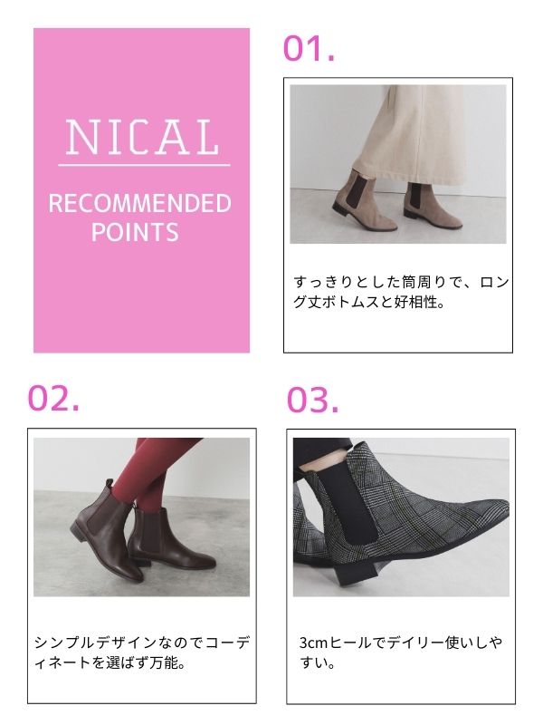 NICAL定番のサイドゴアブーツに新色が登場!美シルエットのサイドゴアブーツ。すっきりとした筒周りでロング丈のボトムスと相性が良く、様々なコーディネートを楽しめます。