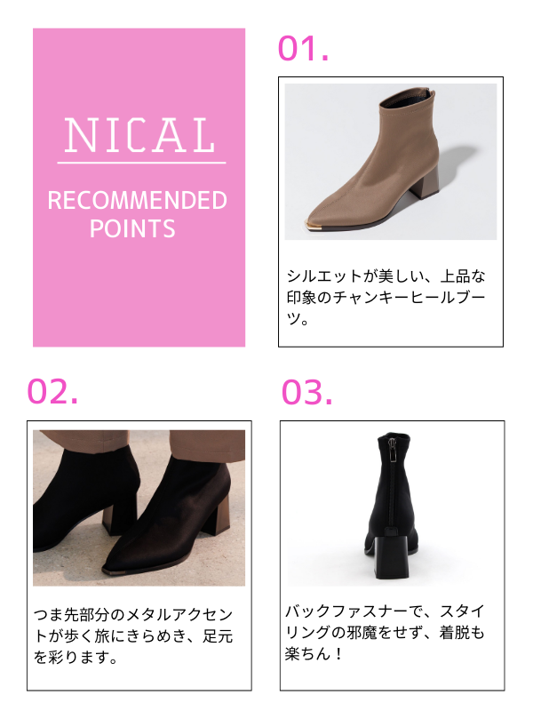 シルエットが美しいチャンキーヒールブーツは安定感のある履き心地でデイリーに合わせたくなる一足。 つま先部分のメタルアクセントが歩くたびにきらめき、足元を彩ります。アッパーにはマット質感の生地を使用し、上品な印象に。 バックファスナーでスタイリングの邪魔をせず、着脱も簡単にしていただけます。万能なブラックときれいめにも合わせやすいグレーの2色展開。