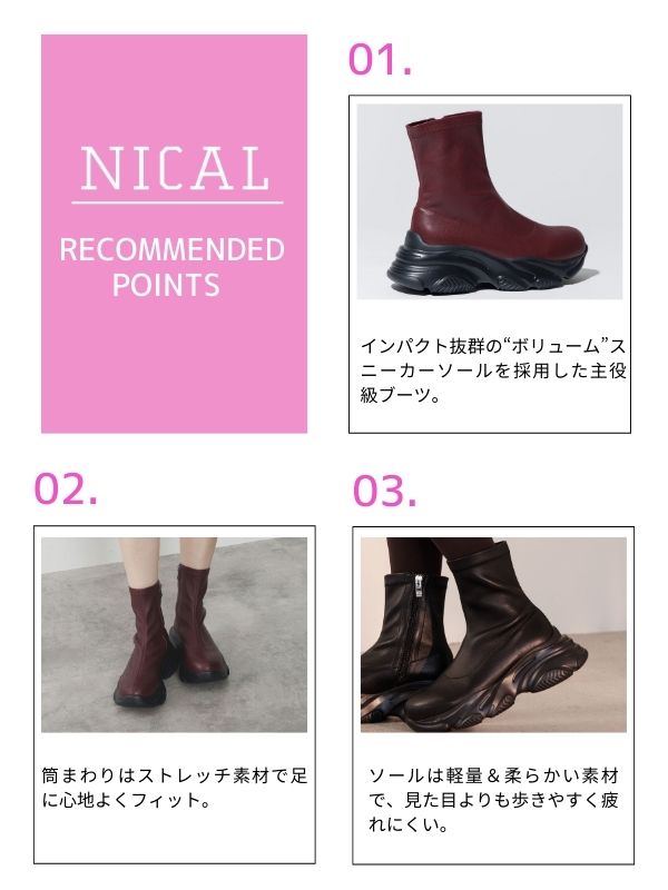 とことんボリュームを持たせたスニーカーソールがインパクト大のブーツは、履くだけでコーディネートの主役になる1足。筒回りはストレッチ素材で足当たりが良くフィットするので、ボリューミーなソールと組み合わせることで細見え効果が抜群です。ソールには軽量で柔らかい材質を使用しているので見た目以上に歩きやすく疲れにくいのも嬉しいポイント。いつものコーデに合わせるだけでトレンドライクになれるブーツになっています。