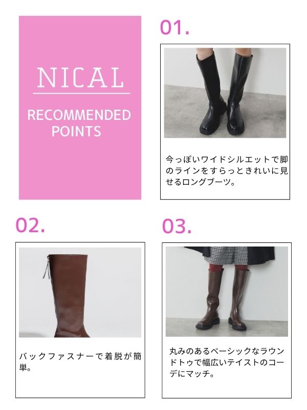 今っぽいワイドシルエットがすらっときれいな脚のラインを演出してくれるロングブーツ。