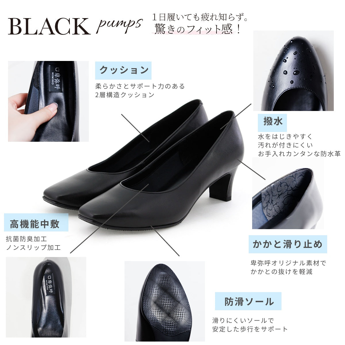 ヒール5cm、スクエアトゥのプレーンパンプスです。ベーシックなヒールの高さで、すっきりきれいに履けるシルエットになっています。雨の日の式典やお仕事でもOKの撥水タイプ。中敷きの細部まで黒で統一し、よりフォーマルな仕様に仕上げました。