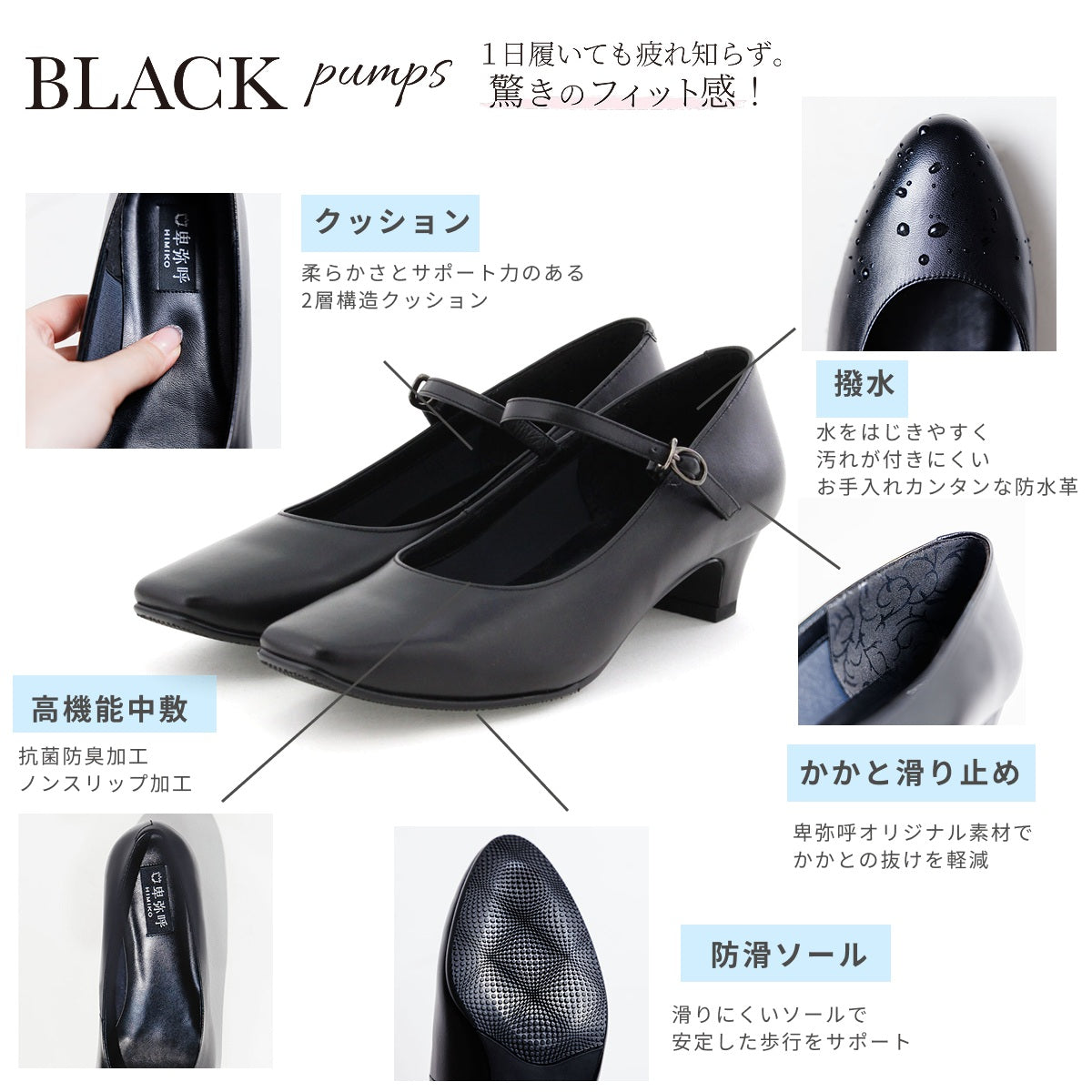 定番のブラックパンプスシリーズに待望の新デザインが登場。ヒール3.5cmのスクエアトゥ のプレーンパンプスにストラップをつけたことで、安定感のある歩きやすい履き心地です。パンプス初心者の方や、ヒールを履きなれていない方に特におすすめ。中敷きの細部まで黒で統一し、より落ち着いた印象に。