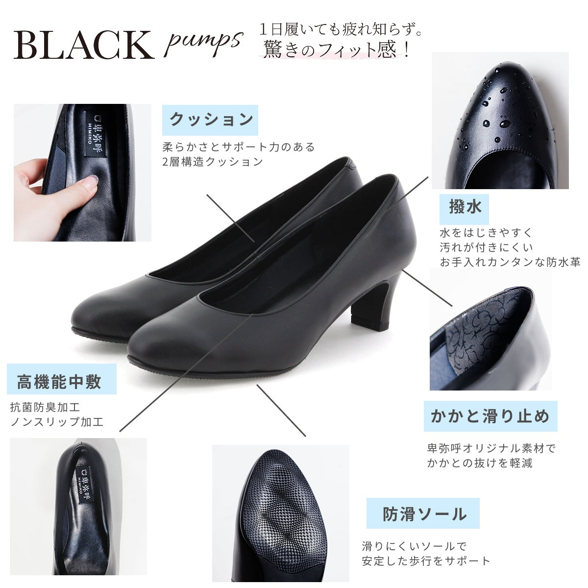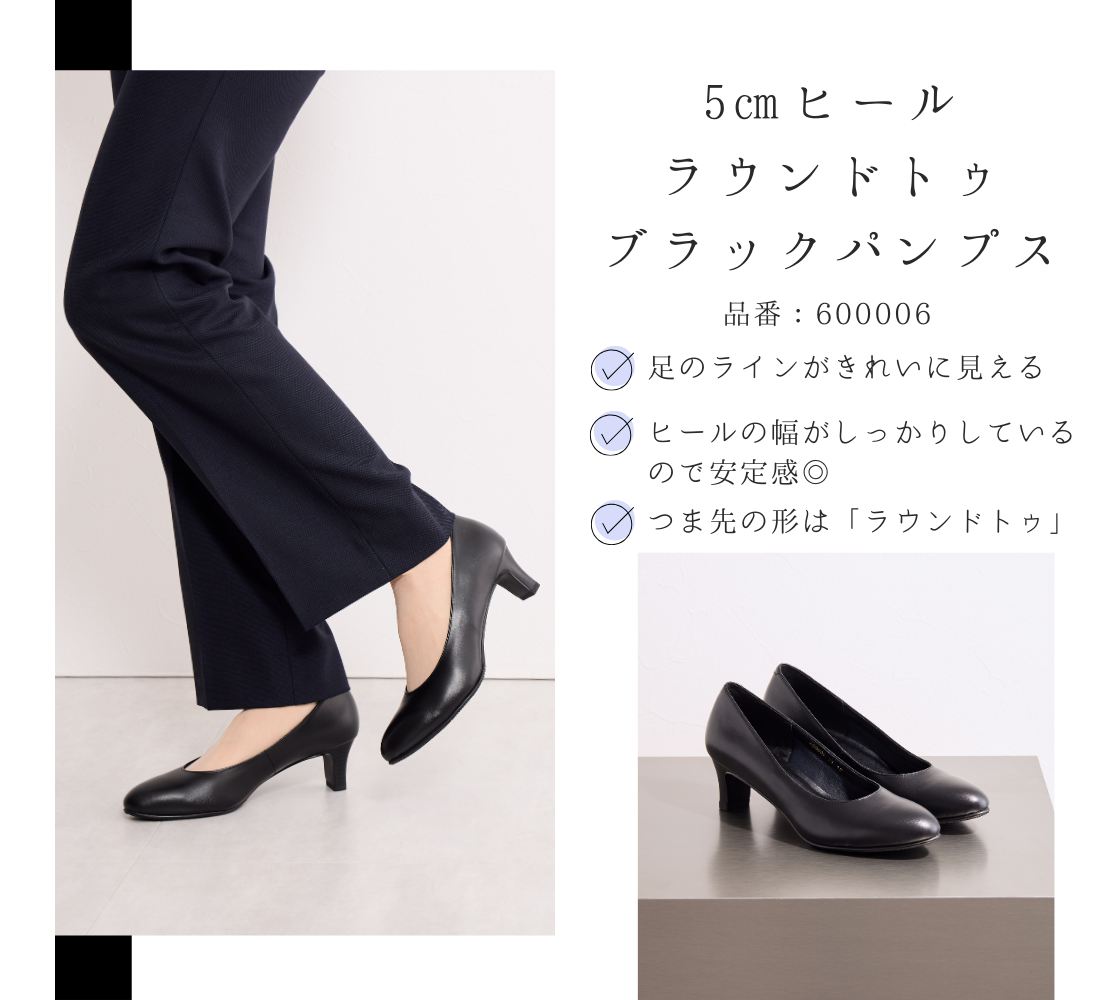 定番のブラックパンプスシリーズに待望の新デザインが登場。5cmヒールラウンドトゥのプレーンパンプスです。足のラインがきれいに見えるのにヒールの幅がしっかりしているので安定感のある歩きやすい履き心地です。年齢や流行を問わず、どなたにもお履き頂ける汎用性の高いアイテムに仕上がっています。中敷きの細部まで黒で統一し、より落ち着いた印象に。