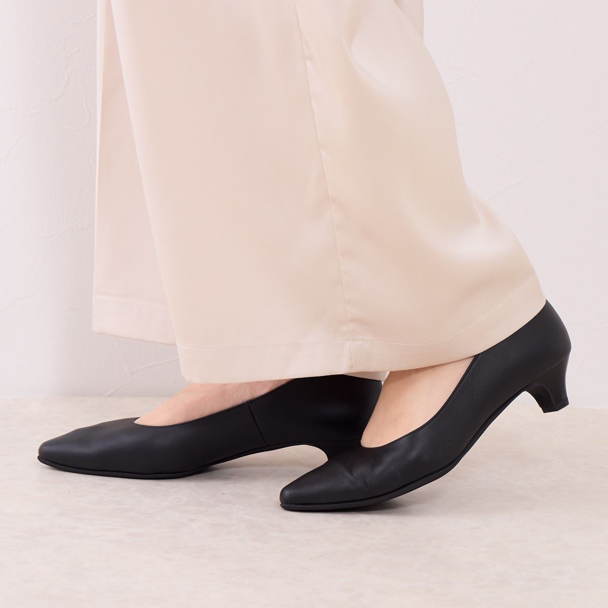 すっきりとしたシルエットながら、やや丸みのあるポインテッドトゥがデイリー使いにぴったりなプレーンパンプス。3.5cmの程よい高さのヒールは、横から見るとシャープな印象ながら、幅をしっかりと取っているため安定感のある履き心地です。