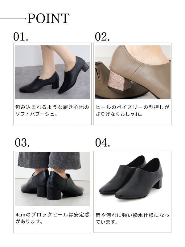 すっきりとしたスクエアトゥで、甲を包み込む深めのカットが包まれるような安心感のある履き心地。 カカトを踏めるバブーシュ仕様。 ヒール巻革に使用したペイズリー型押もアクセントに。ヒールの傷も目立たせにくいのもさり気ないポイント。 ブーツ感覚で履ける為、シーズンレスで履ける一足です。