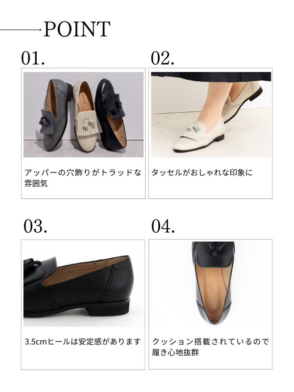 卑弥呼で大人気のデザインをリバイバルしたWEB限定の復刻シリーズ。 アッパーの穴飾りとタッセルデザインがトラッドな雰囲気に。さりげないタッセルがほどよい立体感で足元にメリハリを出してくれます。 深めのアッパーで安心感がありつつも、すっきりとしたつま先がフェミニンなコーディネートにもマッチする一足です。※天然皮革特有の風合い(しわ感)が見受けられる場合がございます。