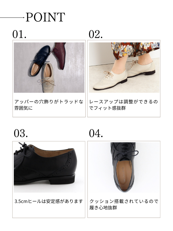 アッパーの穴飾りがトラッドな雰囲気に。甲で調整できるレースアップシューズはフィット感も抜群です。