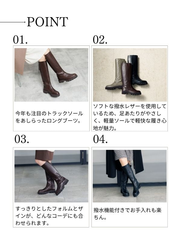 今年も人気のトラックソールを使用したロングブーツ。 ソフトな撥水レザーを使用しているので足当たりも柔らかく、軽量ソールで軽くて履きやすいのがポイント。 すっきりしたシルエットにシンプルなデザインが、カジュアルにもキレイ目スタイルとも相性が良く、足元を引き締めてくれます。 ハーフパンツと合わせて今っぽく履くのがおすすめです。