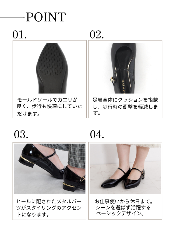 シャープなポインテッドトゥと、華奢なストラップがかわいいメリージェーンパンプスに新色が登場。ブラックは スムース素材でお仕事にも使いやすい。シルバーは今季トレンドのメタリックカラー。クラシックな印象のブラックエナメルは上品な艶がより女性らしく見せてくれます。モールドソールでカエリが良く、安定感のある履き心地が嬉しいポイント。 トレンドのソックス合わせもおすすめです。