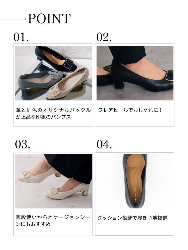 革と同色のオリジナルバックルが上品な印象のパンプス。シャープなスクエアトゥと程よいくびれのフレアヒールでレディーな雰囲気が楽しめる一足。ブラック、グレーは飽きのこないベーシックなデザインで、オンオフ問わずに使える優秀パンプスです。アイボリーは春夏カラーのツイード素材でさりげない存在感があります。普段使いはもちろん、セレモニーシーンもおすすめです。