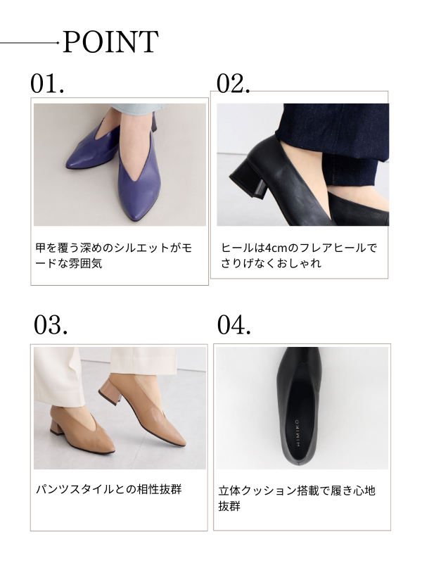 甲を覆う深めのシルエットが、スタイリングに取り入れるだけで品よくモードな雰囲気にアップデートしてくれるVカットパンプス。