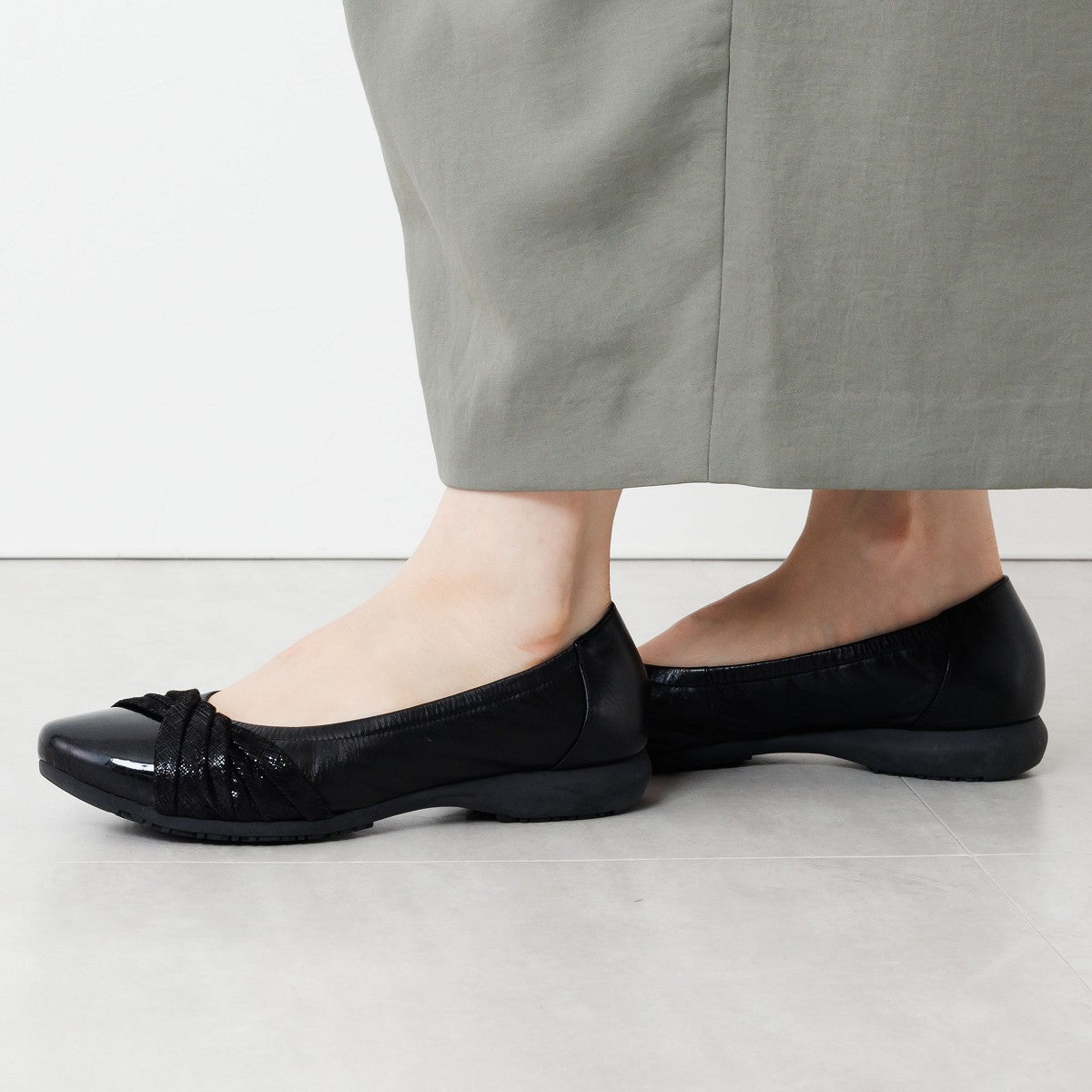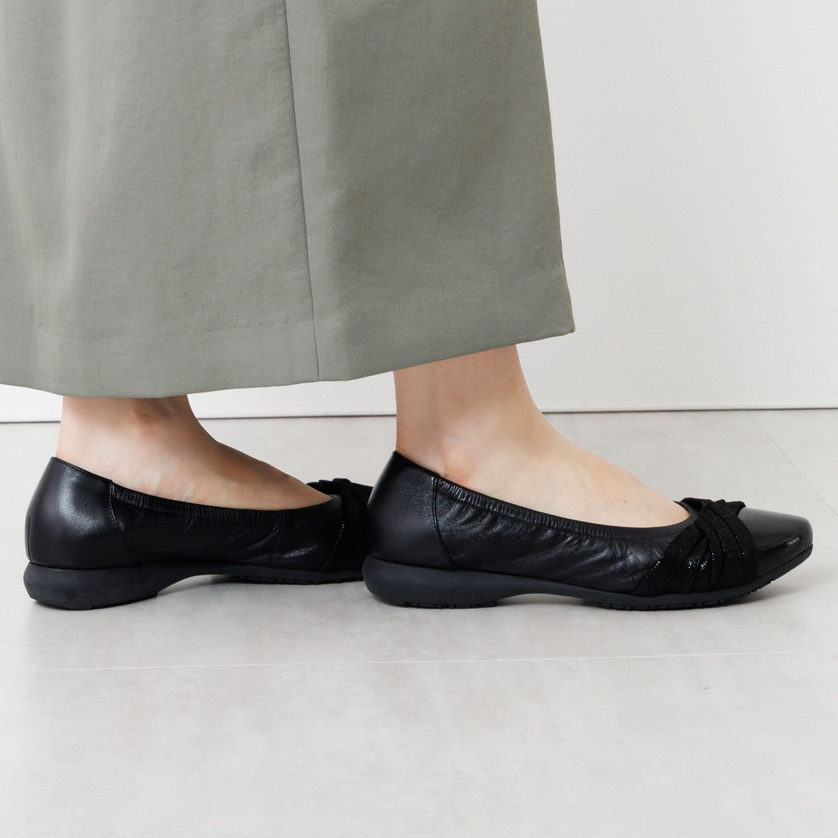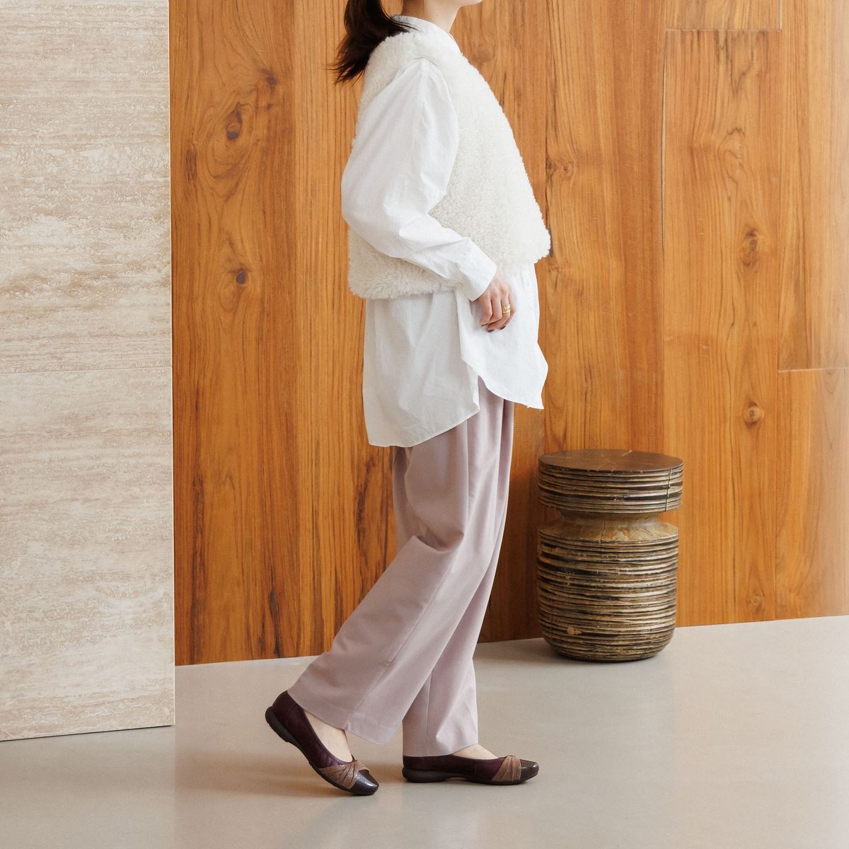 クリア箔加工を施した上品なプリーツリボンが大人な雰囲気に仕上げてくれます。中底全体に入った低反発クッションが足にフィットし、長時間の歩行でも快適な履き心地。 25AWの新色に、どんなコーディネートにも馴染むグレージュ、トレンドカラーを上品に取り入れたボルドーが登場します。