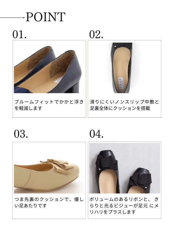 花びらのように重なったボリューム感のあるリボンと、きらりと光るビジューが足元にアクセントを与えてくれます。 安定感のある太めのヒールで、歩きやすさもばっちり。 ベーシックで使いやすいブラック、重くなり過ぎずコーディネートを足元で締めてくれるネイビーとDグレー、上品な印象のボルドー、春らしさ満点のイエローの5色展開。普段使いはもちろんオケージョンにもおすすめです。