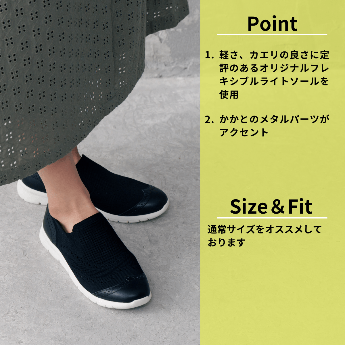 軽くてカエリの良いオリジナルフレキシブルライトソールを使用したニットスニーカー。人気のデザインに新色のグレー、ベージュが登場♪スリップオンスタイルとソフトで柔軟性があるニットアッパーが相まって、足にぴったりとフィットする洗練されたスポーティーなスタイルと快適さを保ちます。かかとのメタルパーツがポイントになり、大人のきれいめニットスニーカーとして幅広いコーディネートと合わせる事ができます。