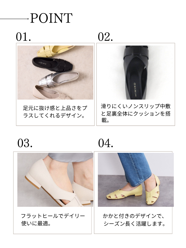 カジュアル感もありつつ、足元に抜け感と上品さをプラスしてくれます。かかと付きデザインで春から秋口までシーズン長く履けるのも嬉しいポイント。 フラットソールで歩きやすく、見た目以上に軽量でたくさん歩く日にもおすすめです。つま先をカバーしつつ抜け感のあるデザインはこれからの季節に大活躍間違いなし。素足はもちろんソックス合わせなどでもお楽しみください。