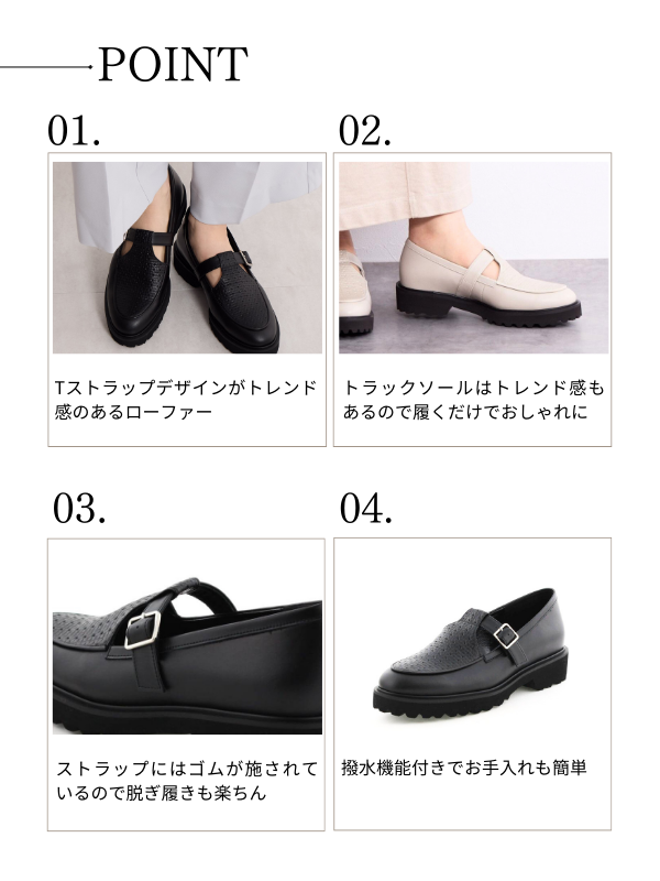すっきりとした丸みのあるつま先と甲のTストラップデザインがクラシカルで目を引くローファー。