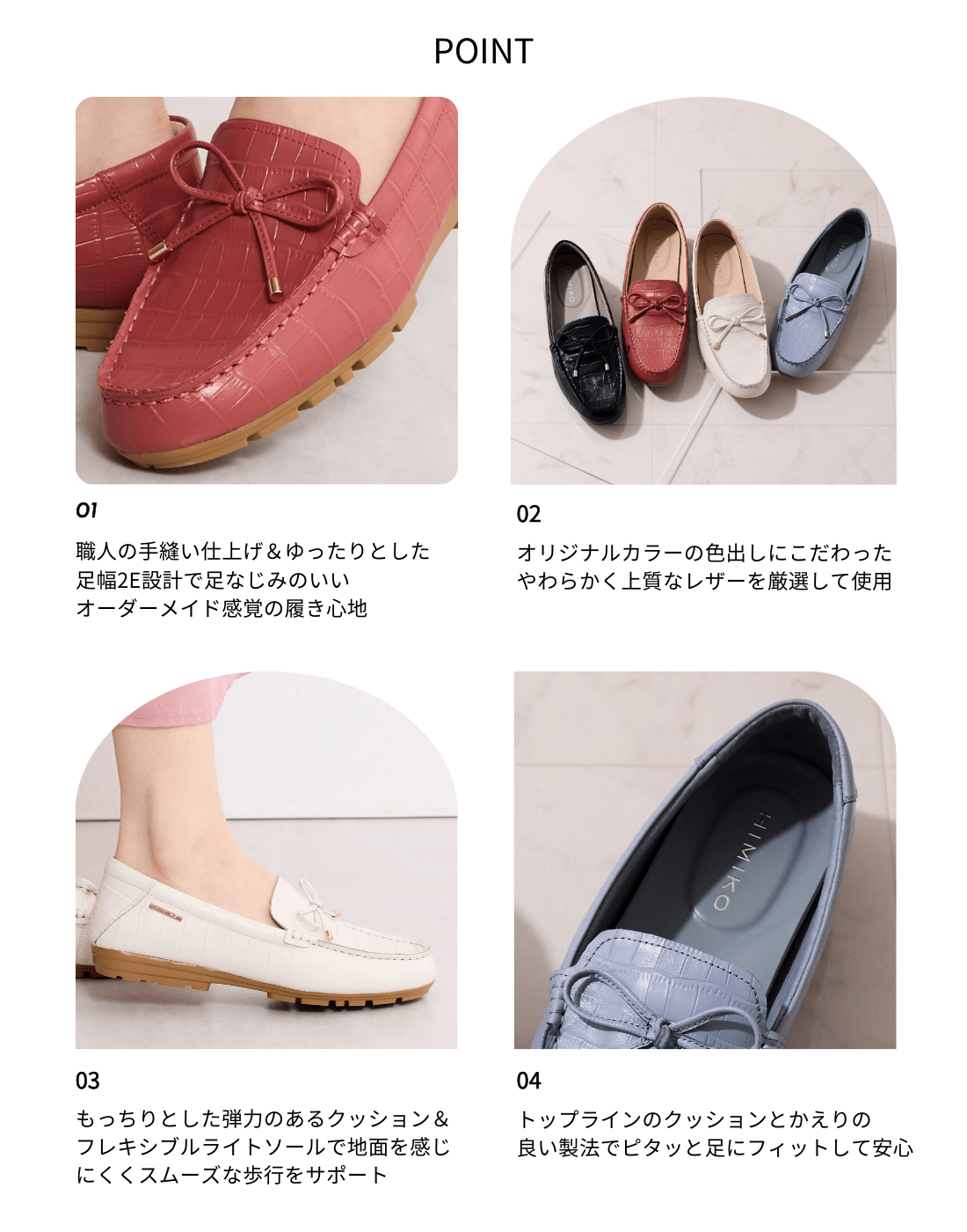 ボディは柔らかなクロコの型押しレザーを使用し、2E相当の幅ゆったりめの木型で履き心地も◎。モカ部分は職人がひとつひとつ手縫いで作っているため、履くたびに足にぴったり馴染みます。スカートやワンピースなどのきれいめコーデはもちろん、カジュアルファッションやパンツに合わせても上品なコーディネートにまとまる一足です。