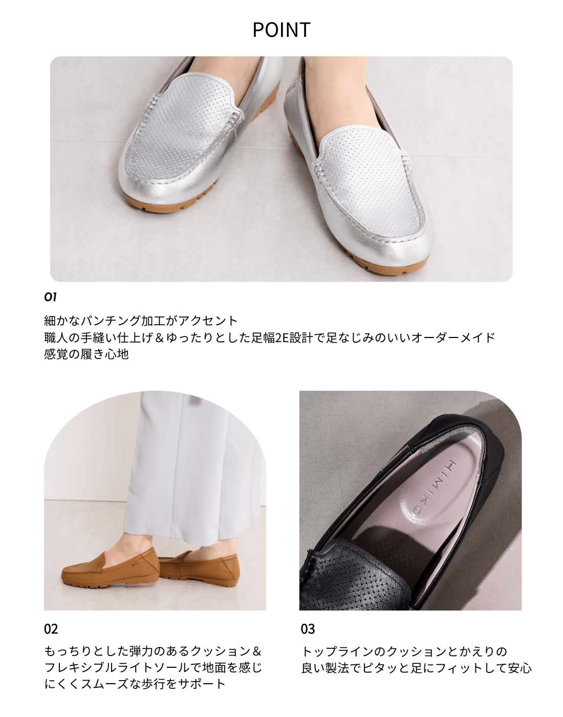 モカ部分は職人がひとつひとつ手縫いで作っているため、履くたびに足にぴったりと馴染みます。シンプルで使いやすいデザインに、細かなパンチング加工がアクセントになった一足。定番のブラック、ブラウンに加え鮮やかなグリーン、トレンド感満載なシルバーの4色展開です。