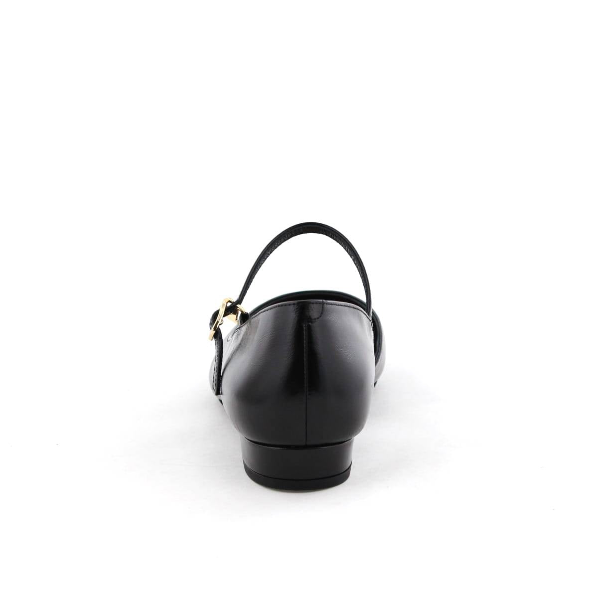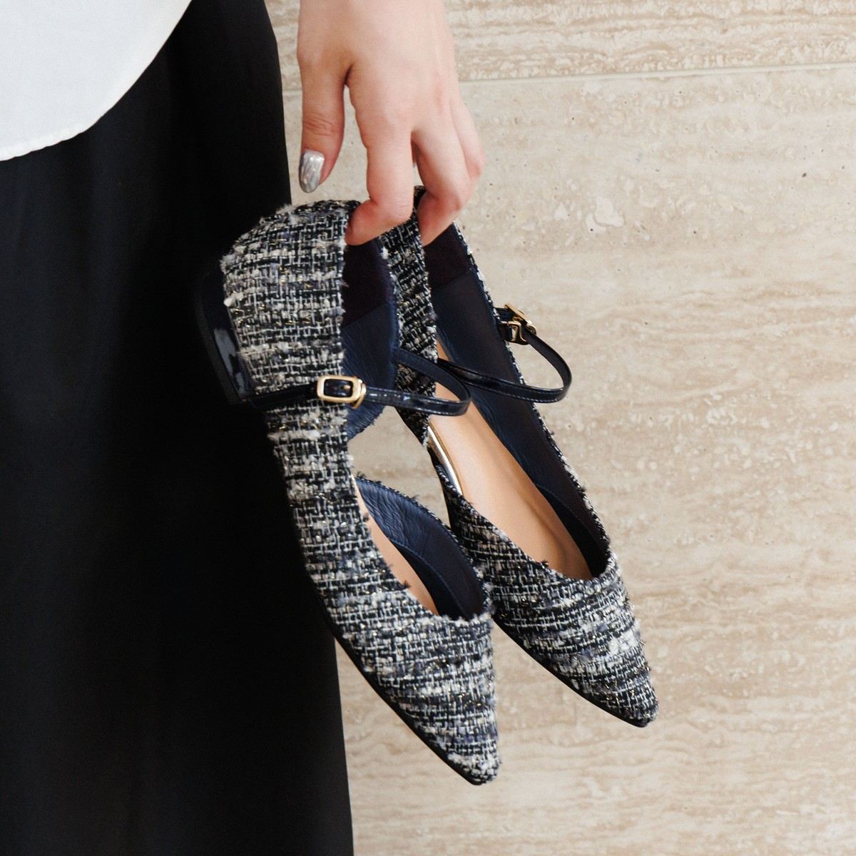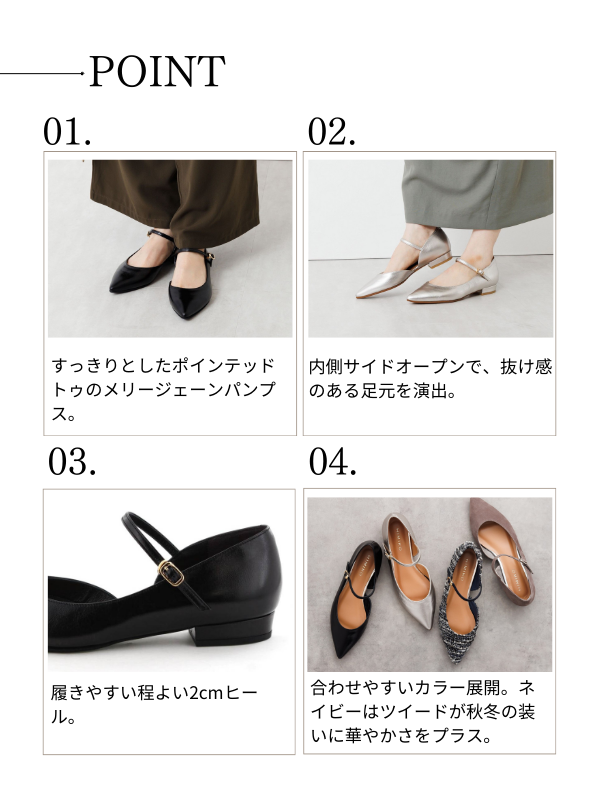 女性らしいすっきりとしたポインテッドトゥのメリージェーンパンプス。