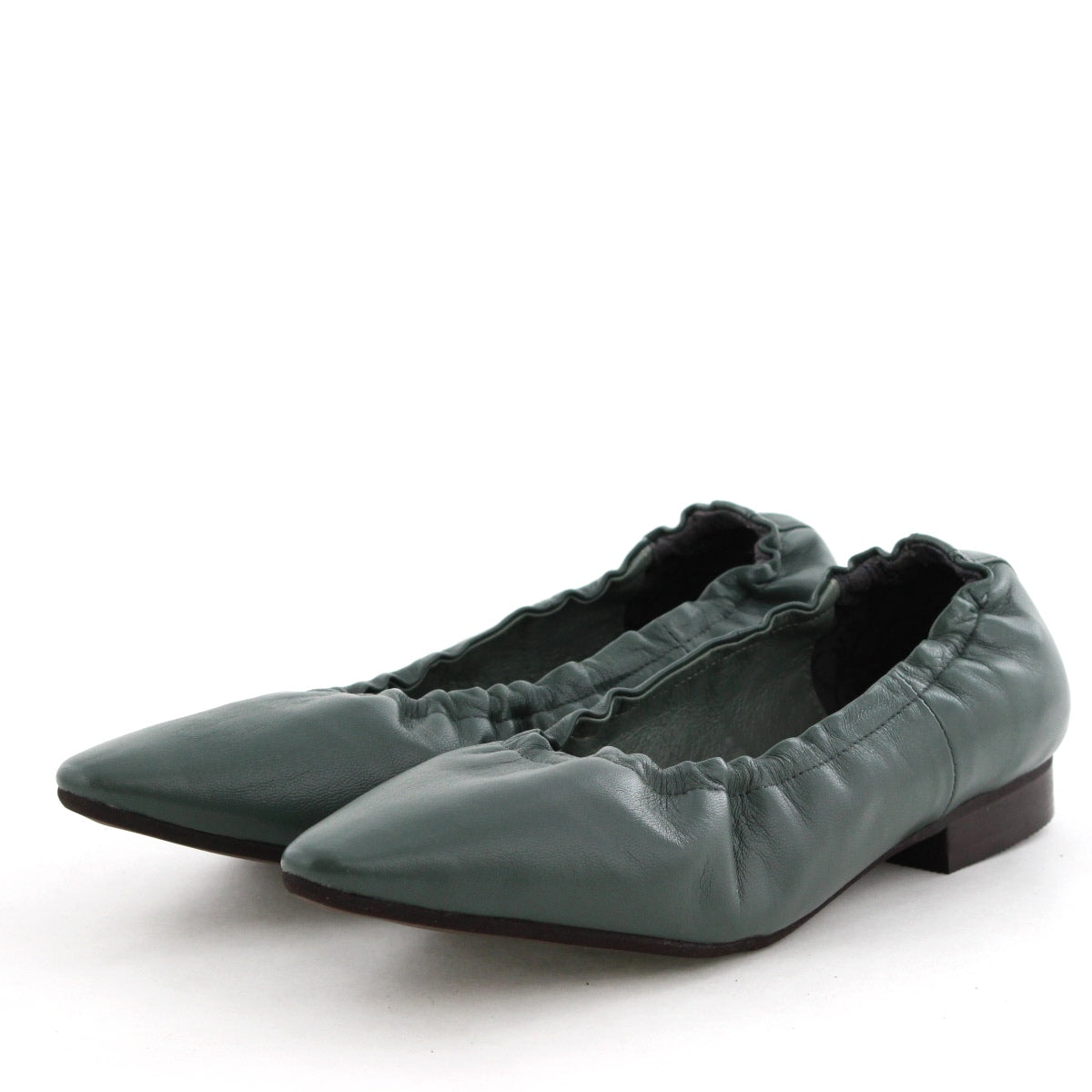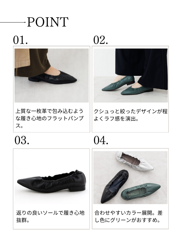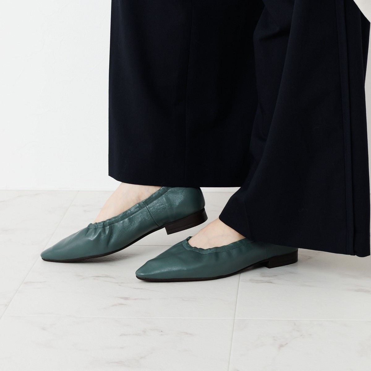 履き口に伸縮性のあるシャーリングを仕込み、上質な一枚革で包み込むような足入れのフラットパンプス。