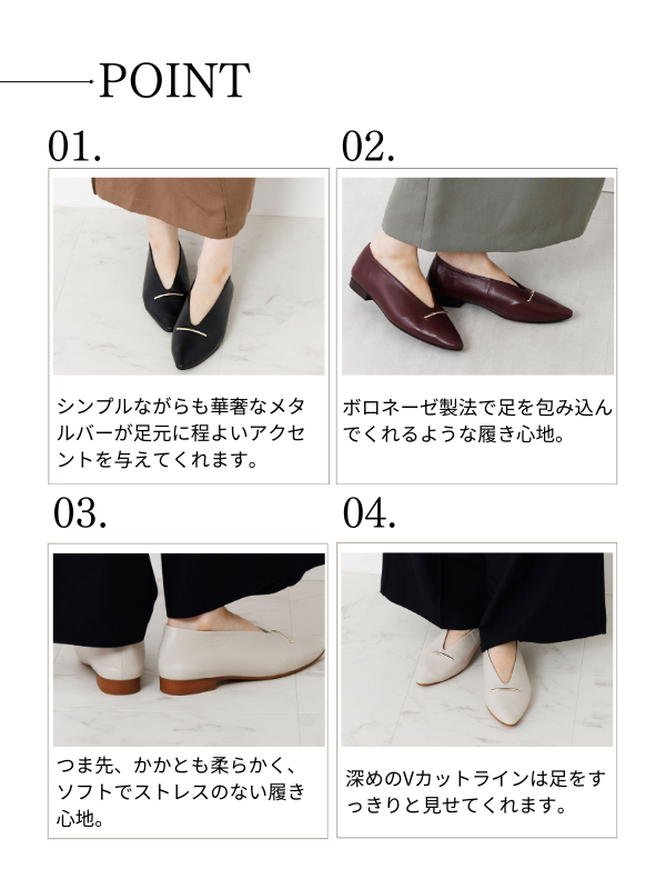 秋冬らしい甲を覆う深めのデザインがモードな雰囲気にアップデートしてくれます。 ボロネーゼ製法でソールのカエリも良く、上質な一枚革で足を柔らかく包み込みます。つま先、かかとも柔らかく仕上げているのでソフトでストレスのない履き心地。 きちんと感がありつつもリラックスしたムードにも合わせやすい万能パンプスです。