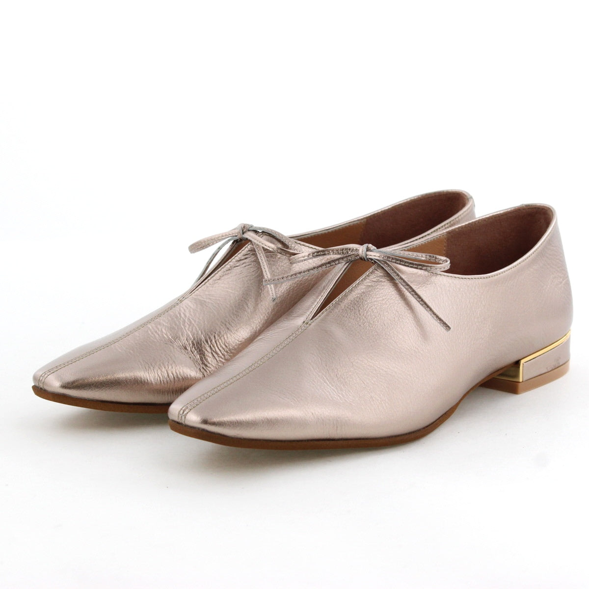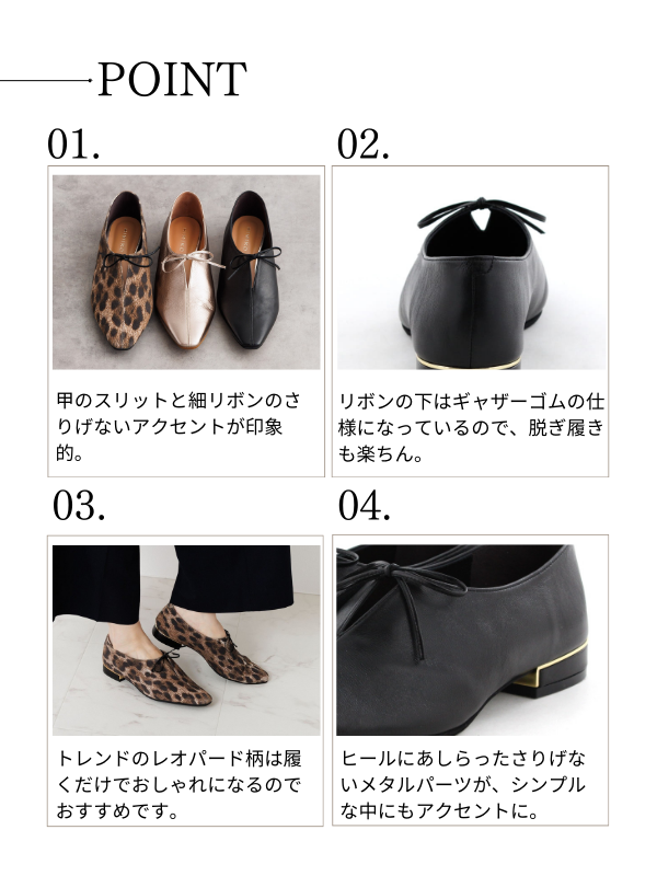 リボンの下はギャザーゴムの仕様になっているので、ワンステップでそのまま脱ぎ履きできます。 柔らかなシープ素材が足を包み込み、つま先、かかともソフトに仕上げているのでストレスのない履き心地。 パンプスとして履けるきちんと感と程よいリラックスムードも持ち併せた、シーン問わず履いていただける一足です。