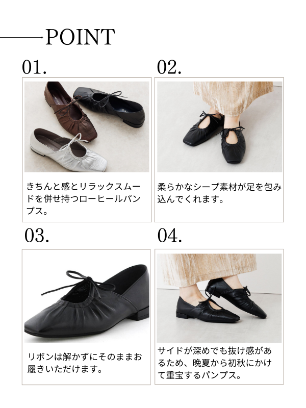 フロントのラウンドカットしたギャザーデザインと細リボンが目を引き、大人のきちんと感とリラックスムードもを持ち併せたローヒールパンプス。