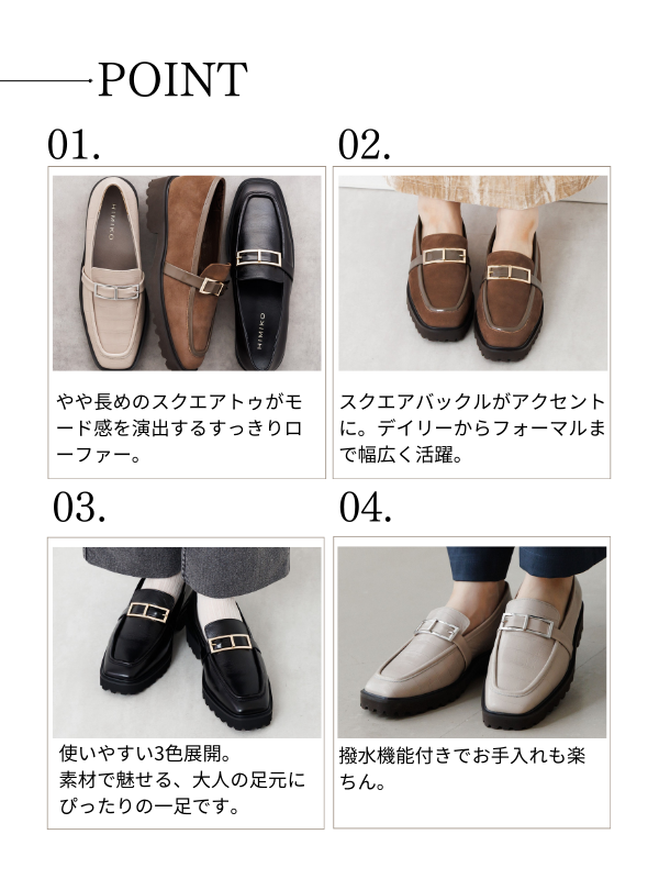 トゥ先がやや長めのラストを採用し、すっきりとしたスクエアトゥシルエットでモードな印象のローファー。 スクエアのバックルがコーディネートのアクセントになり、デイリーからフォーマルまで幅広いシーンをカバーしてくれます。ブラックはやや光沢感のあるスムースレザーで革の風合いをお楽しみいただけます。アイボリーはクロコ型押しレザー、ブラウンは起毛レザーで秋冬のスタイリングに相性の良い一足です。