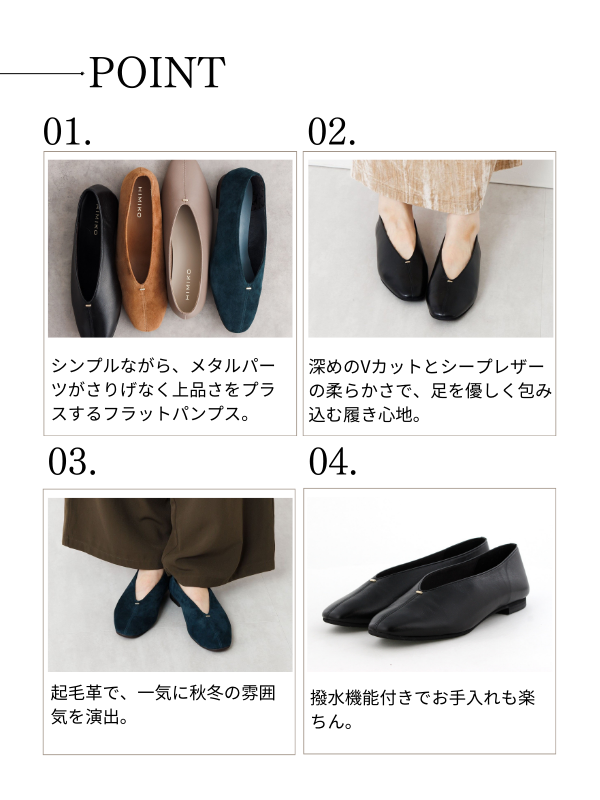 深めのVカットと柔らかいシープレザーで包まれるような履き心地です。つま先、かかともソフトに仕上げているので、足に馴染みやすく快適に履いていただけます。ブラック、グレーはシーンを選ばないスムースレザー、ブラウン、ブルーグリーンは起毛革で取り入れるだけで秋冬のシーズンムードを高めてくれます。