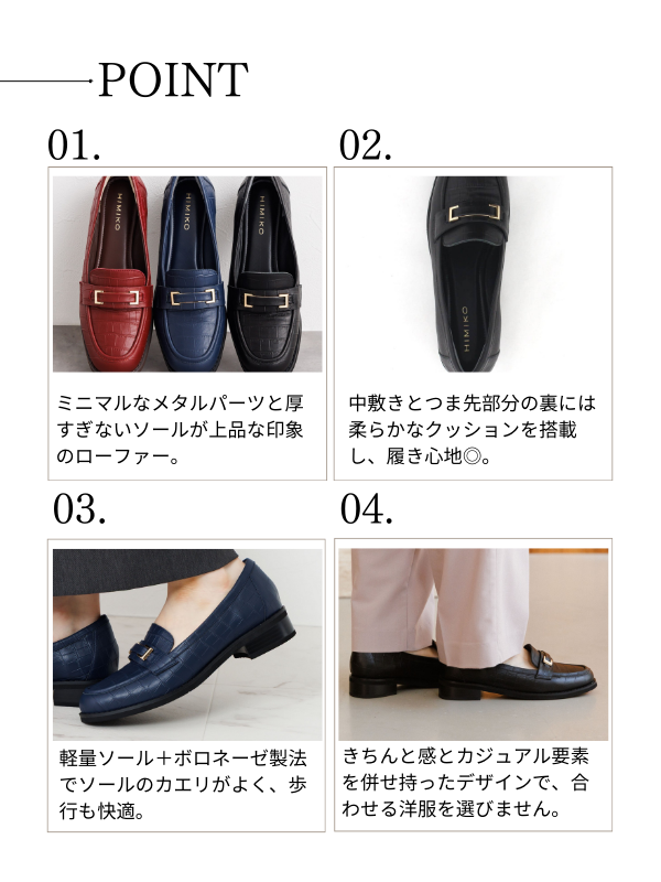 ミニマルなメタルパーツと厚過ぎないソールが女性らしい印象に仕上げてくれるローファー。 中敷きとつま先部分の裏には柔らかなクッションが入っており、足に馴染みやすくストレスのない履き心地です。 クロコの型押しレザーが上品なブラック、ネイビー、レッドの3色展開。 ボロネーゼ製法でカエリが良く、ソールも軽量なためたくさん歩く日やお仕事使いにもおすすめです。