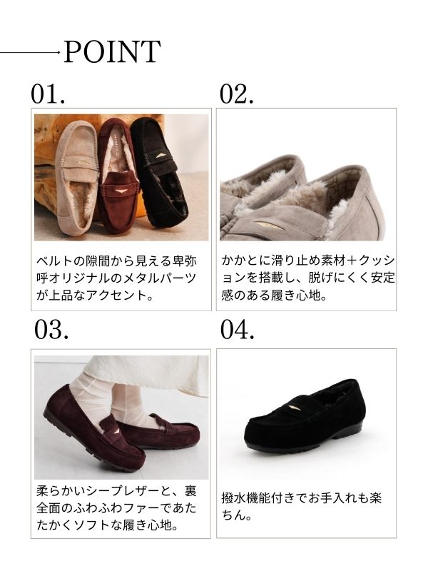 卑弥呼の大人気アイテム、冬の定番ファーモカシンに新デザインが登場!ベルトから覗く卑弥呼オリジナルのメタルパーツがきらりと輝き、足元を上品な印象にしてくれます。