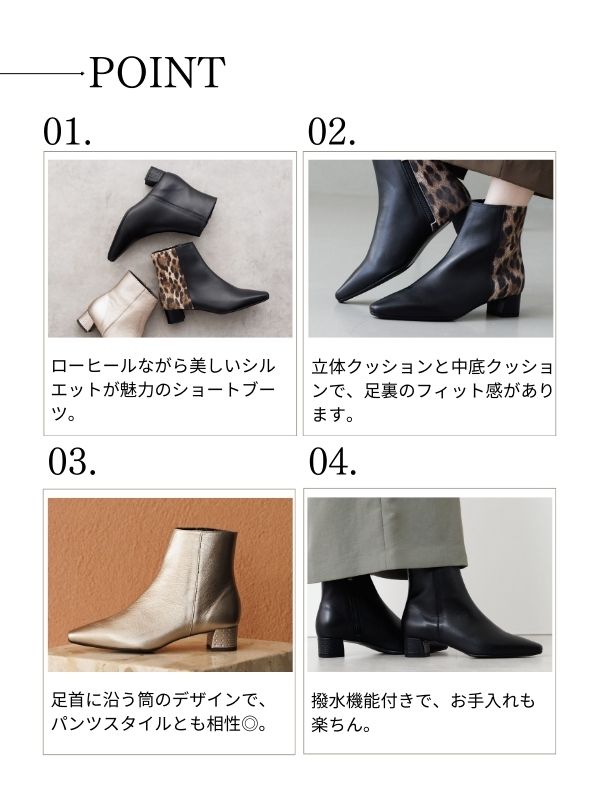 3.5cmのローヒールながらシンプルで美しいラインのショートブーツ。ヒール部分は贅沢にイントレチャート型の本革を使用しています。