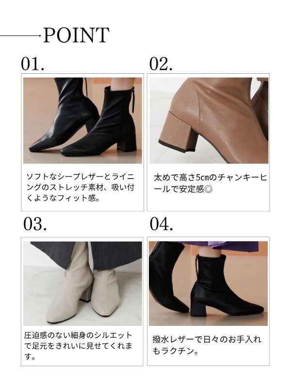 ソフトなシープレザーとライニングのストレッチ素材で、吸い付くようにフィットするショートブーツ。 圧迫感のない細身のシルエットは足元をきれいに見せてくれます。太めの5cmヒールで安定感があり、中敷きにはかかと部分のフィット感アップと衝撃吸収効果を兼ね備えたハーフタイプのインソールを搭載。バックファスナーで脱ぎ履きも簡単です。パンツでもスカートでもコーディネートを選ばず履いていただけます。