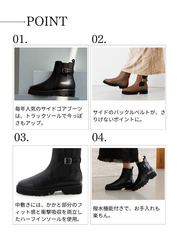 程よい厚みのあるトラックソールのサイドゴアブーツは毎年人気のアイテム。今季はバックル付きのサイドベルトデザインでさりげないアクセントに。