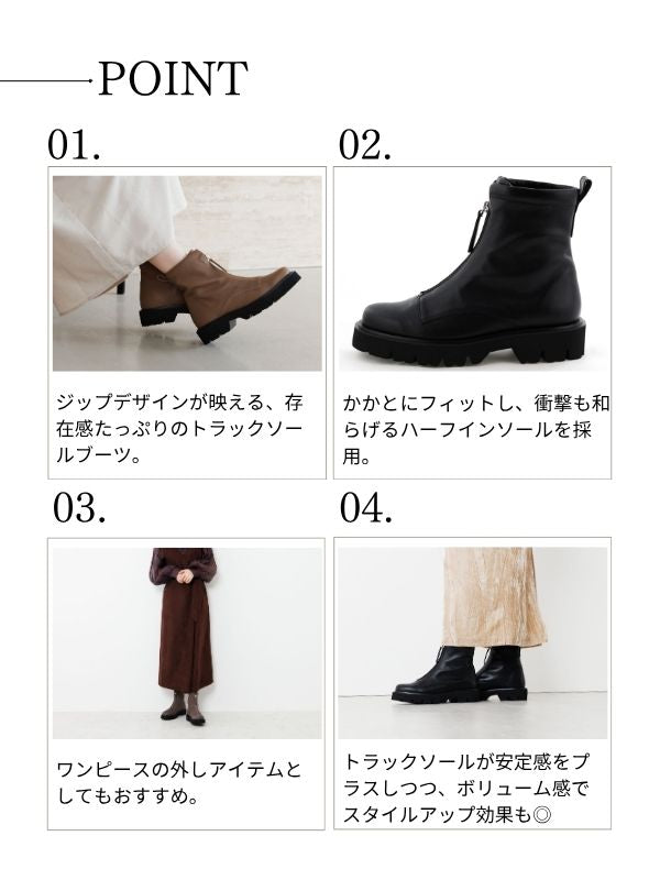 フロントジップがアクセントになったトラックソールブーツ。ボリューム感のあるトラックソールと、ソフトスクエアトゥデザインが履くだけでモードな大人の足元に。