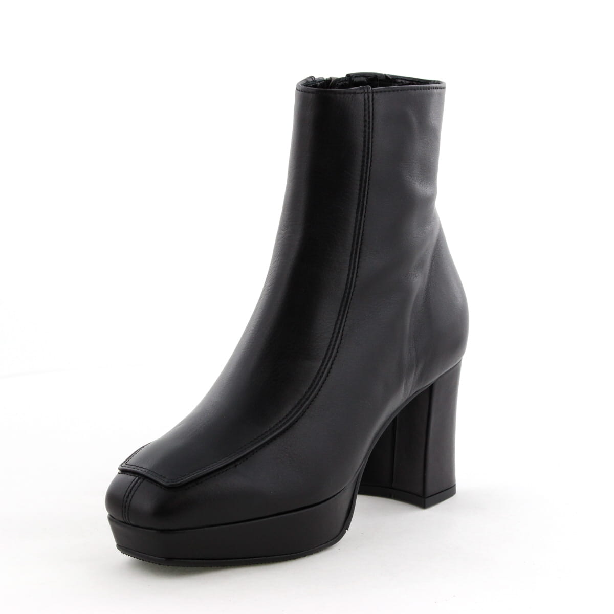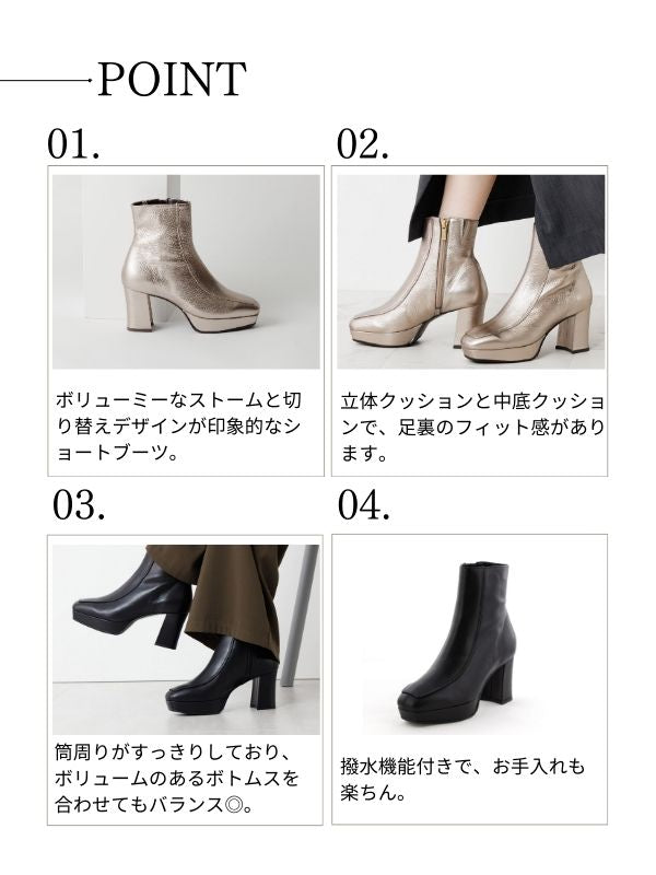 ボリューミーなストームと切り替えデザインが特徴的なショートブーツは太ヒールで安定感を保ちつつ、幅広のスクエアトゥや絶妙な丈感などシルエットにこだわった一足。