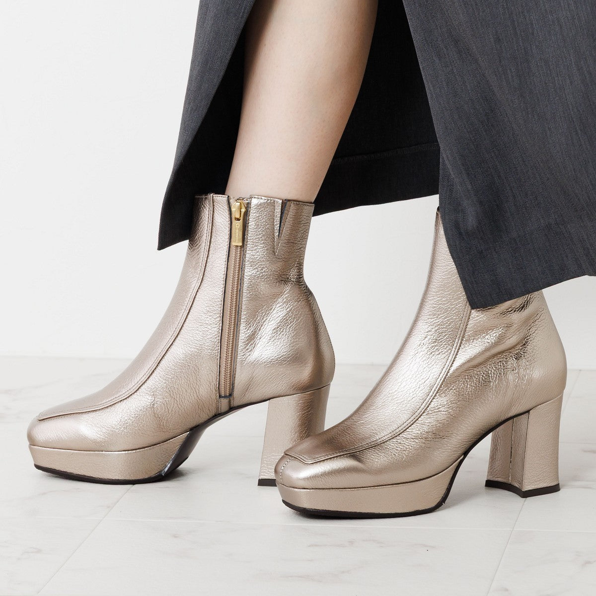 すっきりとしたシルエットで美脚効果が期待できるのも嬉しいポイント。ボリューム感がありつつも、足元にメリハリをプラスしてくれます。幅広いスタイリングに合わせやすいブラックと、コーディネートのスパイスになるゴールドの2色展開。履くだけでコーディネートをモードに格上げしてくれるブーツです。