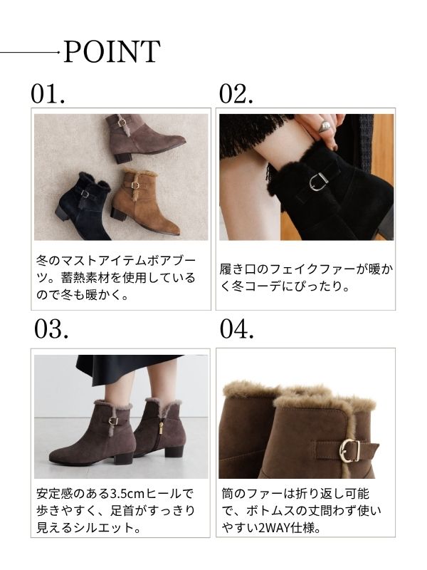 履き口から覗くフェイクファーがあたたかく、冬の足元の定番アイテムです。程よい高さで安定感のある3.5cmヒールと、足首がすっきり見える女性らしいシルエットが人気の秘密。 筒のファー部分は折り返して使用できるのでボトムスの丈を選ばず、フェミニンからカジュアルまで幅広いスタイリングにぴったりマッチします。