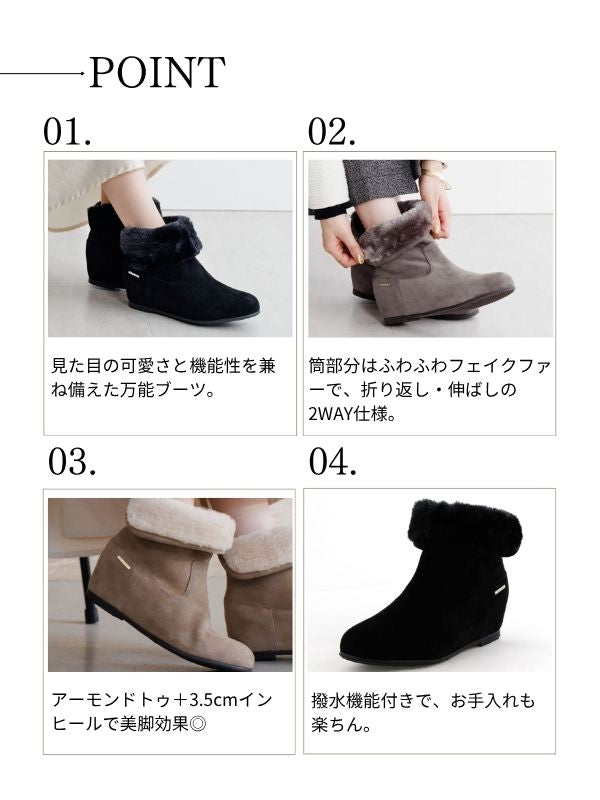 ふわふわのフェイクファーを使用した筒は、折り返しても伸ばしても履ける2WAY仕様。中敷にはボア素材を使用し、指先まであたたかく、ストッキングやタイツで履いても足がしっかりと止まります。すっきりシルエットのアーモンドトゥと、3.5cmのインヒール入りで、美脚効果も◎。 アッパーには撥水加工を施し、汚れが付きにくいのも嬉しいポイントです。防滑ソールで滑りにくく、幅広く活躍する一足です。